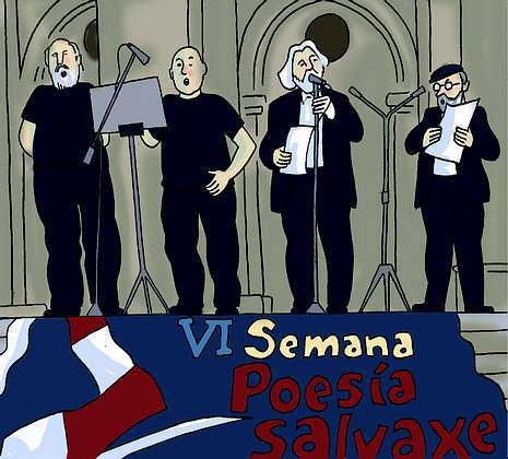 Vin o xoves, así que o mércores estiven en Ferrol con varios amigos e, pola tarde, cando me dispuña a coller o coche no aparcamento da praza de Armas, empezaba un recital de Guillerme Ferrández, Karlotti, Marcos Lorenzo e Víctor M. Díez na celebración da VI Semana da Poesía Salvaxe, e quedei a velos. Leron poemas propios e de Ezra Pound, Walter Whitman, Brecht, Bukowski, Novoneira...